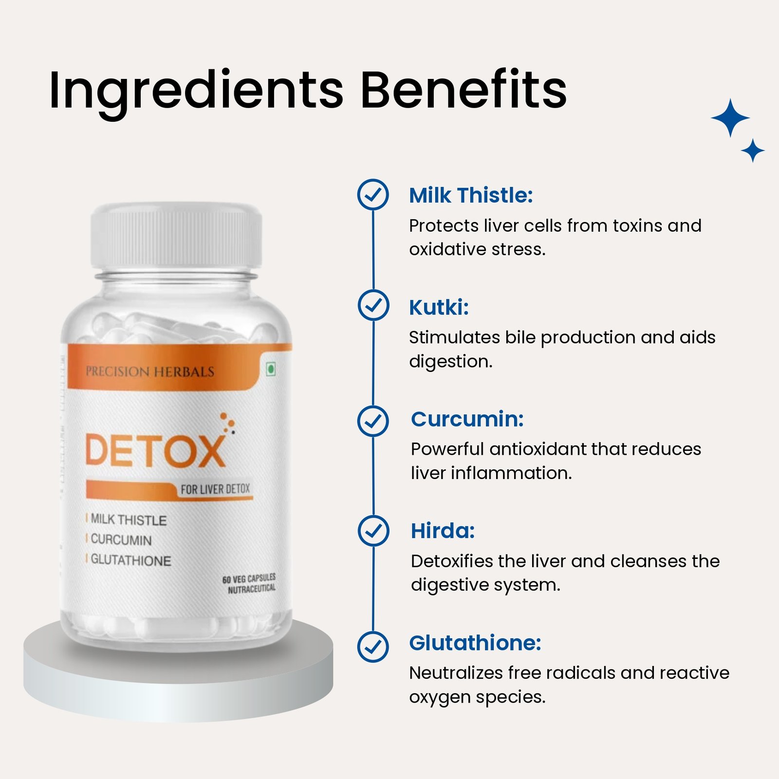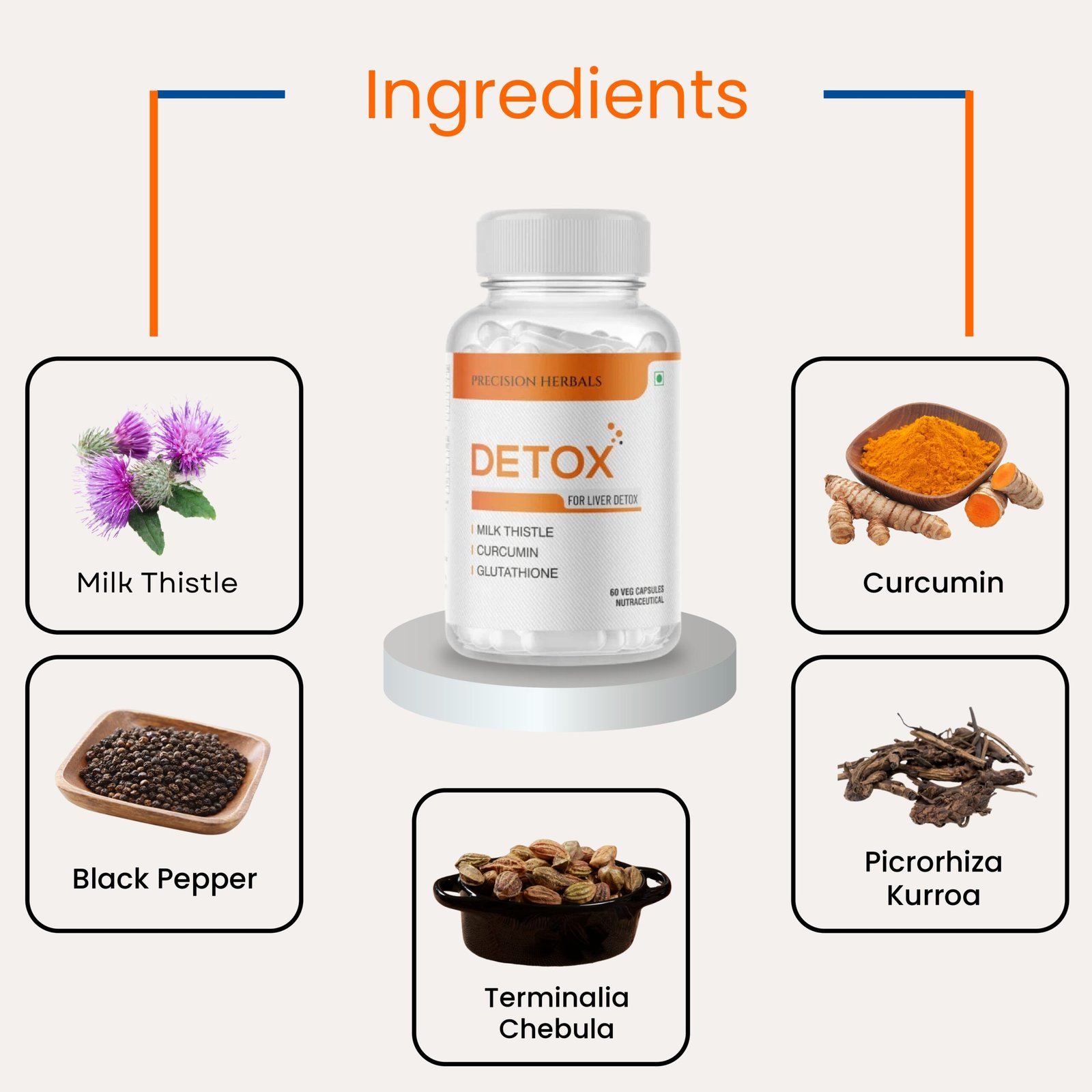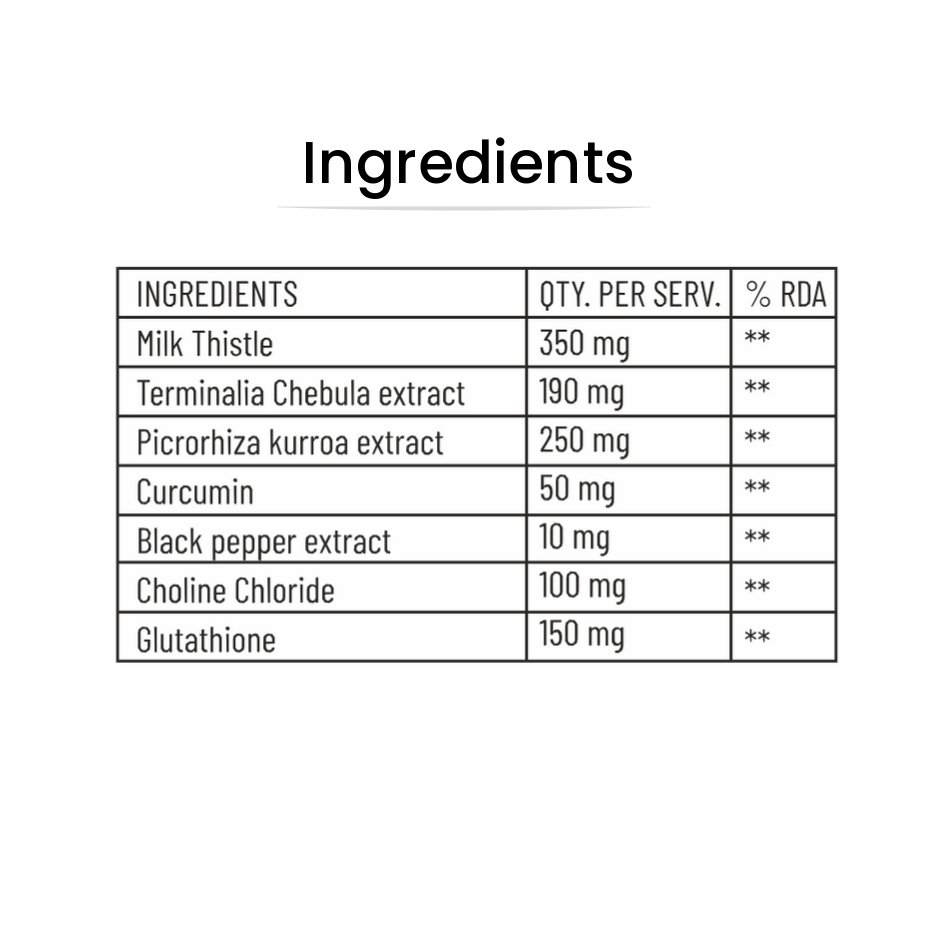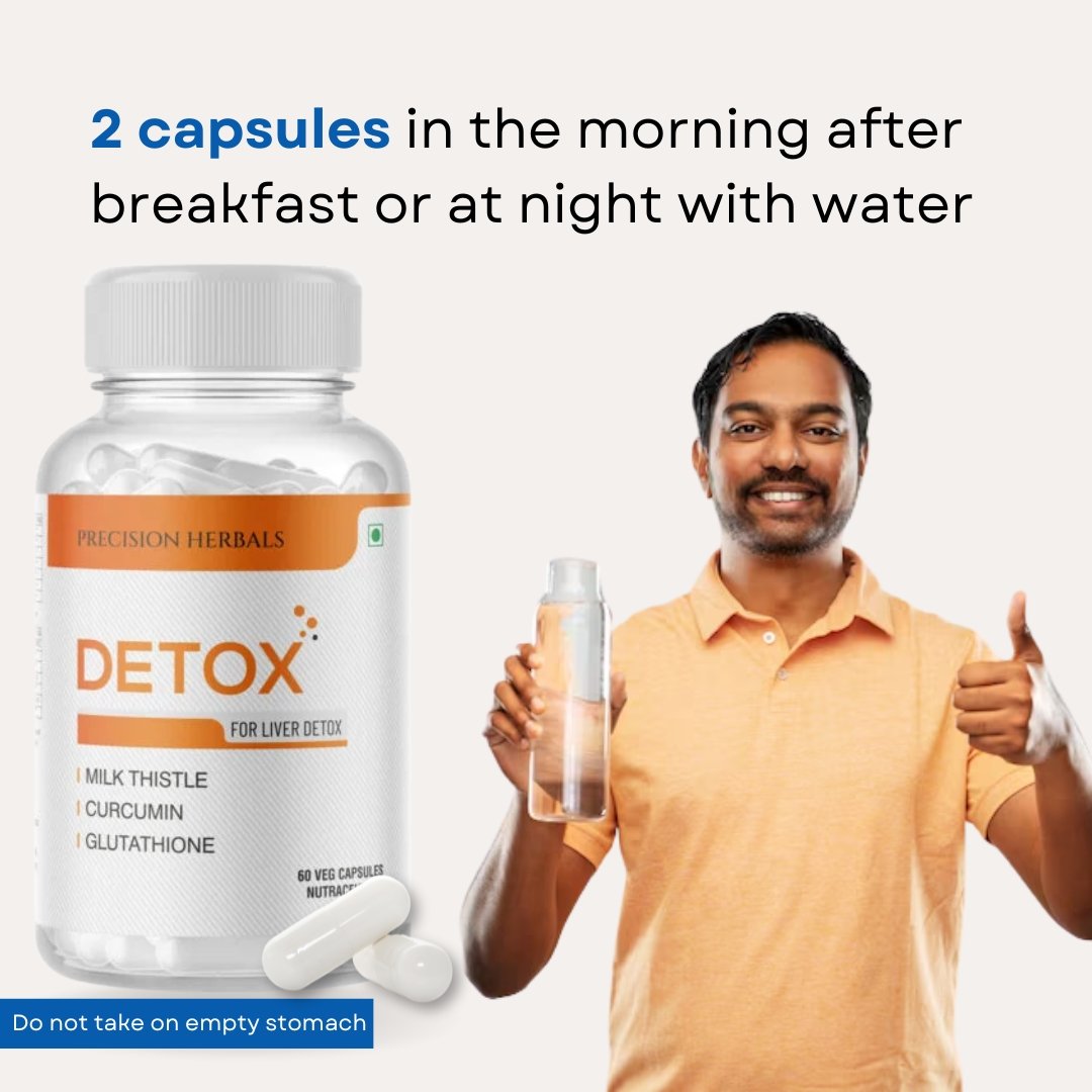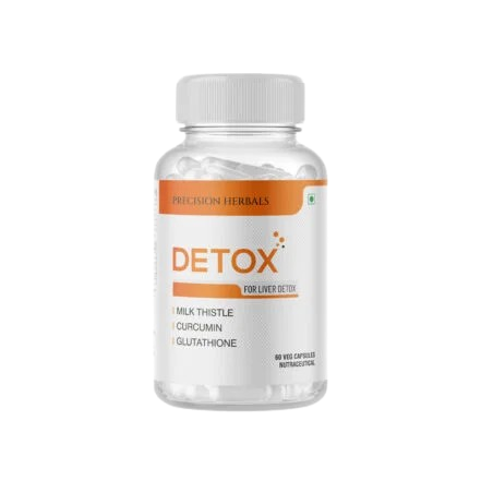 Detox a powerful herbal supplement crafted to enhance your liver health. Infused with clinically proven ingredients like Milk thistle, Kutki, Curcumin, Hirda and glutathione, “Detox” shields your liver from toxins, neutralizes free radicals, prevents toxin build-up, and optimizes liver function. Formulated with robust scientific principles, Detox is meticulously manufactured in an FSSAI-approved, ISO-certified facility, ensuring the highest quality standards.